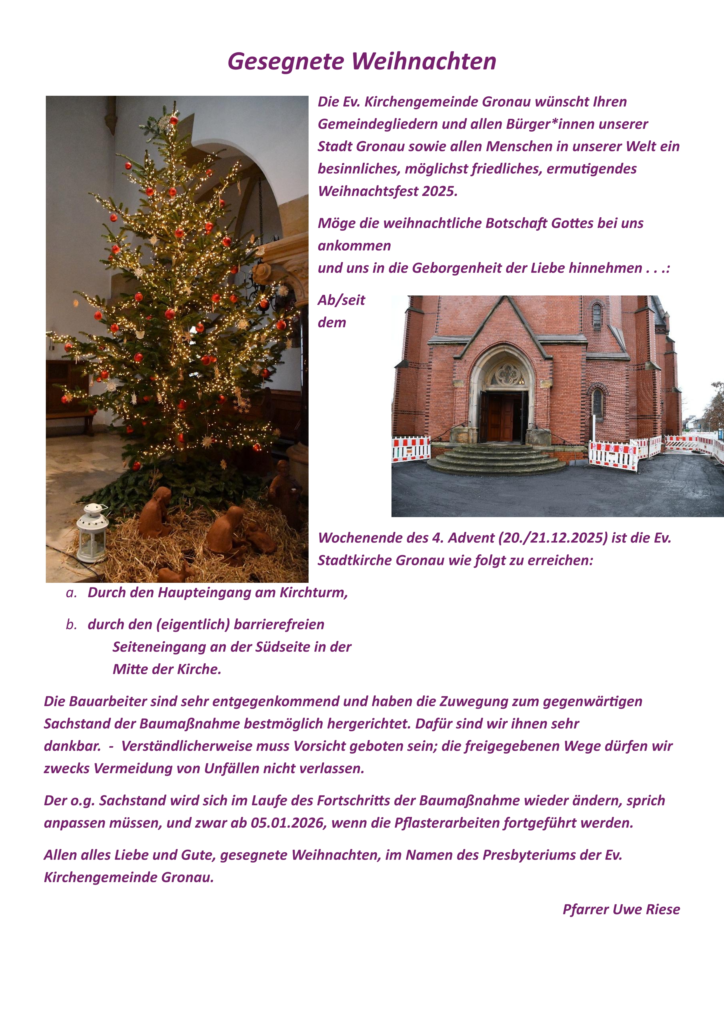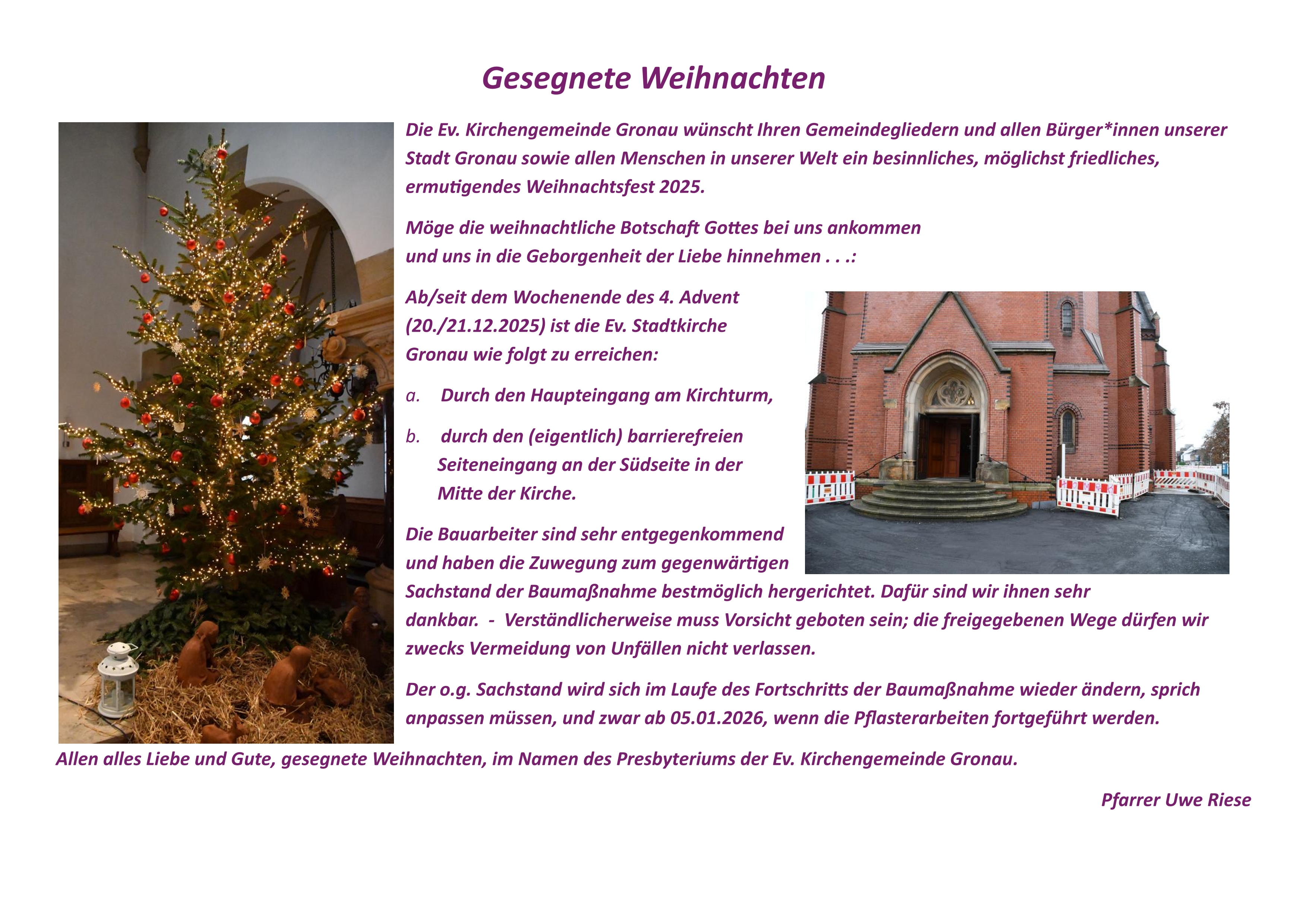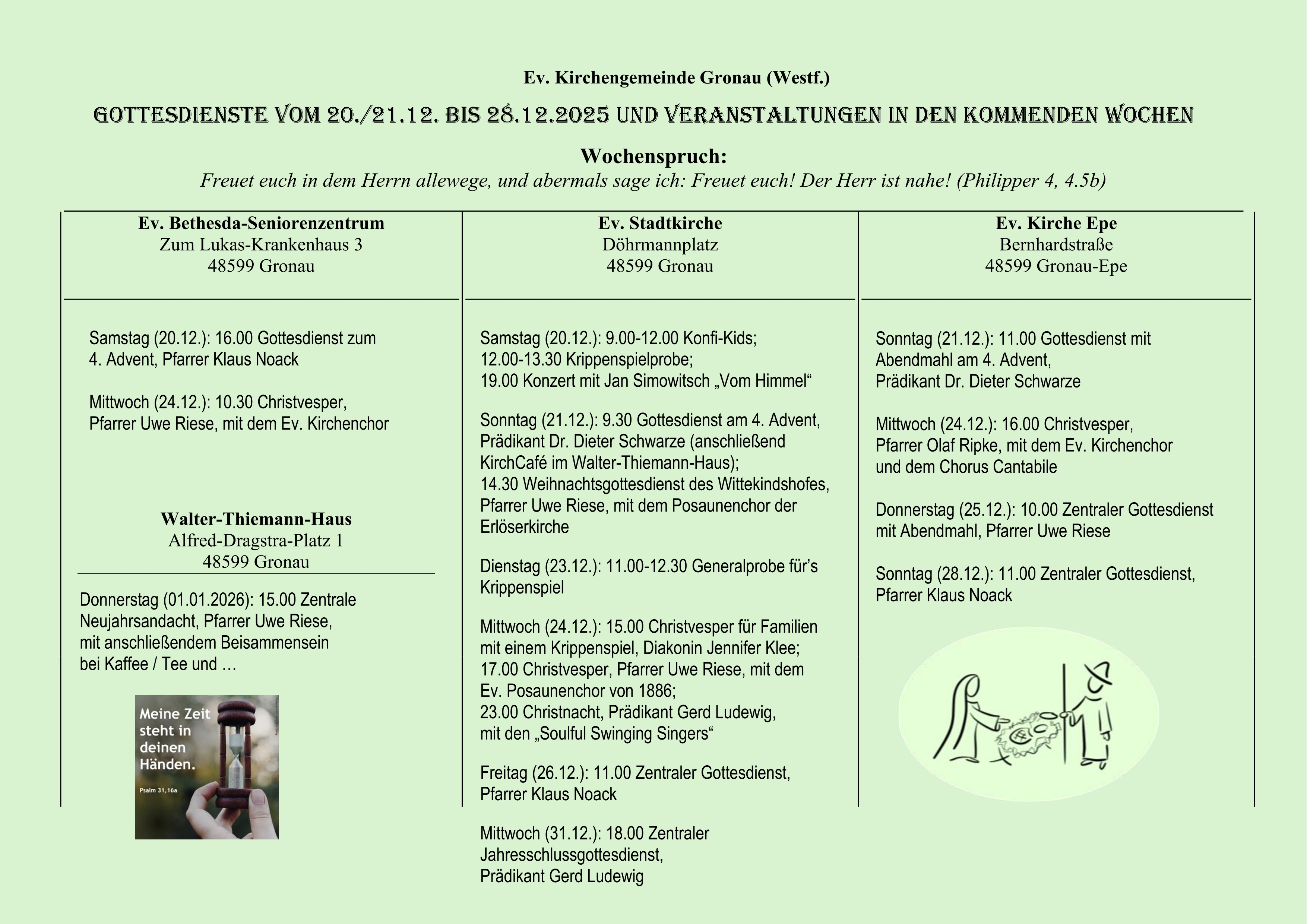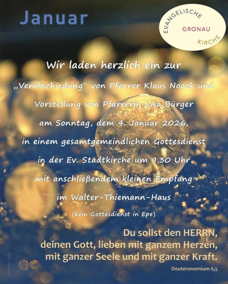 Vieles ist in unserer gegenwärtigen Zeit „im Fluss der Zeit“, im Vollzug der Veränderung und Anpassung. Das ist seit einigen Jahren eine verlässliche Konstante – auch im Leben von Kirche und im Gemeindeleben hier vor Ort bei uns. Die Pfarrstelle II unserer Ev. Kirchengemeinde Gronau, zuletzt Pfarrerin Sabine Kuklinski, ist nun zur Freigabe freigegeben worden. Eine Ausschreibung ist kürzlich erfolgt, eine hohe Anzahl an Bewerbungen wird angesichts des Pfarrer*innen-Mangels nicht zu erwarten sein. Etwaige Bewerbungen werden im Laufe der ersten Monate des Jahres 2026 zu erwarten sein . . .